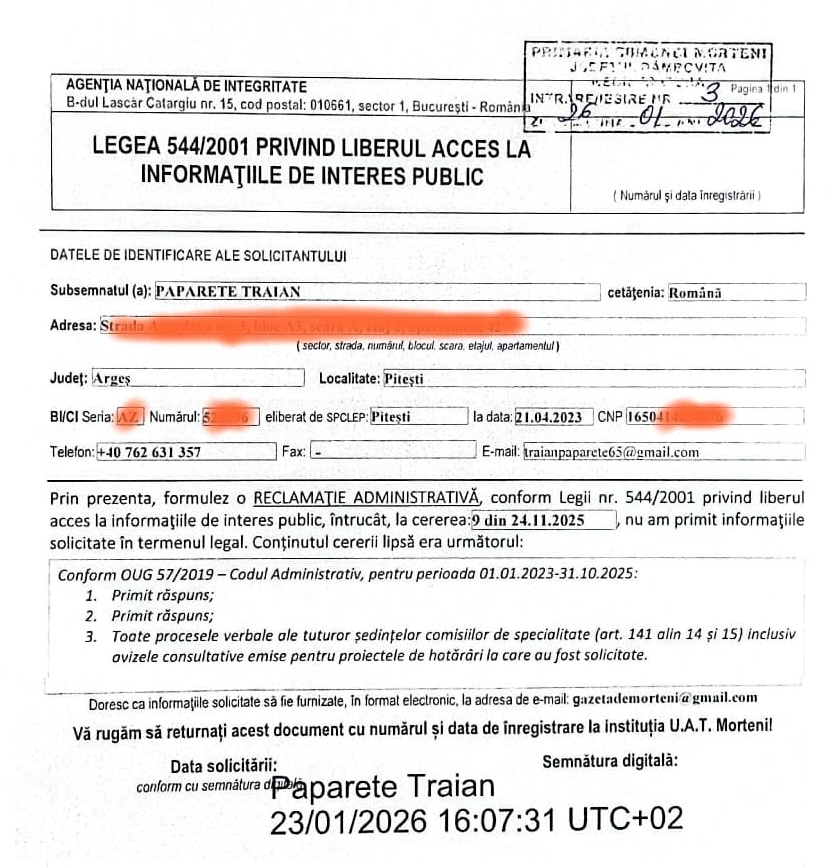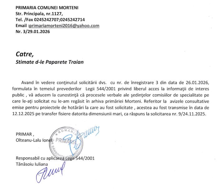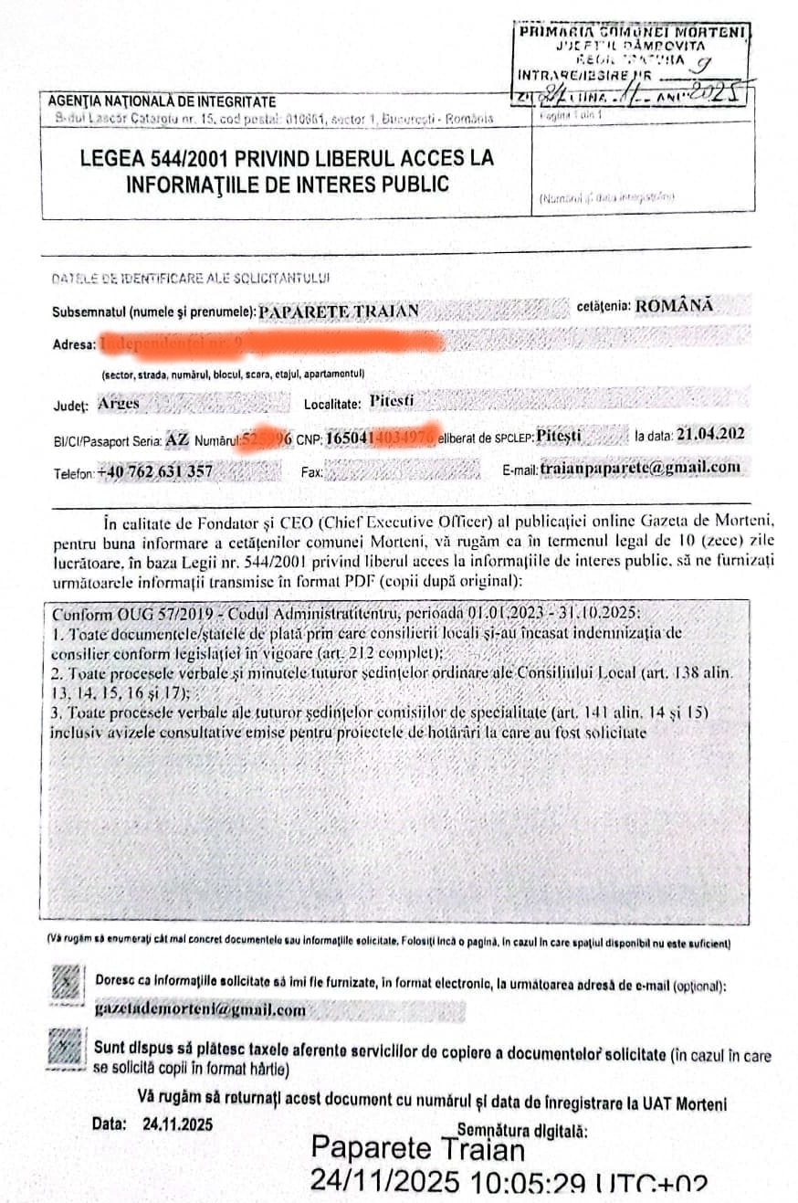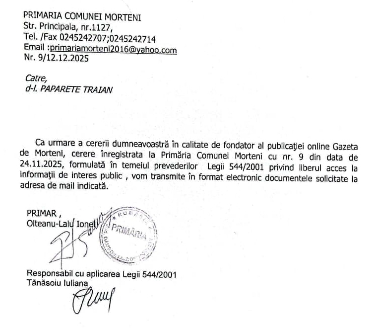 De ce vă spun asta? pentru că în data de 24.11.2025 am depus o cerere în baza Legii 544 pe care o puteți consulta aici, iar răspunsul primit de la Primăria Morteni îl puteți studia aici.